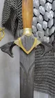 Каждый элемент доспеха изготовлен из благородных материалов и выполнен с максимальной тщательностью. Шлем, выполненный из сплава, украшен сложной резьбой, покрыт никелем и золотом высшей пробы (толщина 10 мкм), что придает ему неповторимый блеск. Меч, созданный из дамасской стали и украшенный натуральным камнем чароит, является символом мастерства и власти.